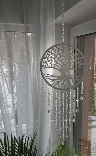 Łapacz wykonany jest ze sklejki 3mm. Kolor biały, matowy. Możliwe widoczne naturalne usłojenie drewna. Wielkość drewnianej obręczy to 25 cm. Mandala ozdobiona akrylowymi kryształkami.