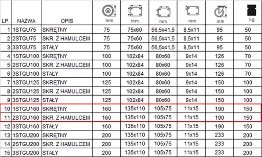 Zestaw składa się z czterech kółek wyposażonych w mocowanie na płytkę. W skład zestawu wchodzą dwa zestawy skrętne z hamulcem o kodzie 2STGU160 (poz.11 w tabeli) oraz dwa koła skrętne o kodzie 1STGU160 (poz. 10 w tabeli).