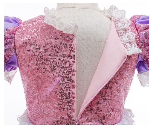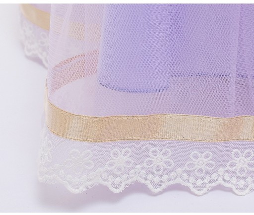 Dół składa się aż z pięciu, mocno marszczonych warstw: trzech warstw fioletowego tiulu i dwóch warstw różowej podszewki.