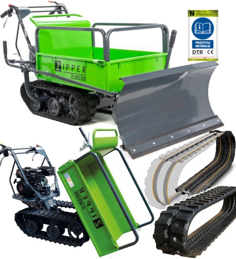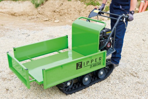 MD 300 to najmniejsza wywrotka z linii maszyn składającej się w sumie z pięciu maszyn. Jest napędzany czterosuwowym silnikiem 196 cm3 pochodzenia azjatyckiego. Silnik ma moc 4,8 kW (6,5 KM) i jest uruchamiany kablem. Napędza skrzynię biegów za pomocą paska klinowego. Ma trzy biegi do przodu, jeden bieg wsteczny i położenie neutralne. Skrzynia biegów to skrzynia biegów. Bezpośrednio stąd napędzane są dwie gąsienice. Łańcuchy mają szerokość 180 mm. Gąsienice gumowe służą do cichej pracy i niskiego obciążenia podłogi. Prostokątna powierzchnia załadunkowa to 600 x 910 mm. Przednie i boczne wsporniki można wyciągnąć i zablokować za pomocą śrub zaciskowych. Wtedy powierzchnia załadunkowa ma wymiary 860 x 1040 mm. Zipper określa maksymalną ładowność jako 300 kg.