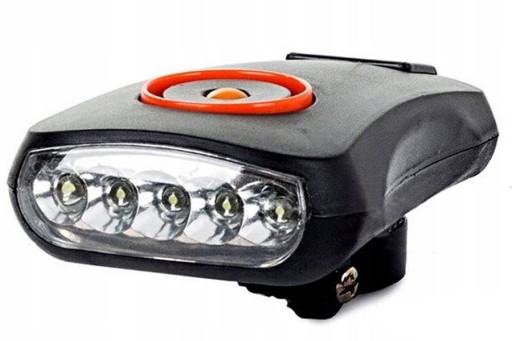 Pięcio-diodowa przednia lampka rowerowa z przeźroczystym pierścieniem poprawiającym widoczność na drodze. Zasilanie przód: 3 baterie typu AA.