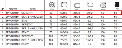 Komplet 4 szt. kół fi 50 szafka regał 1PPGUM50