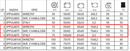 W skład kompletu wchodzą jeden zestaw mocowany na płytkę o kodzie 1PPGUM75 (w tabeli pod pozycją nr 4), jeden zestaw mocowany na płytkę z hamulcem o kodzie 2PPGUM75 (w tabeli pod pozycją nr 5) oraz dwa zestawy mocowane na płytkę o kodzie 3PPGUM75 (w tabeli pod pozycją nr 6).