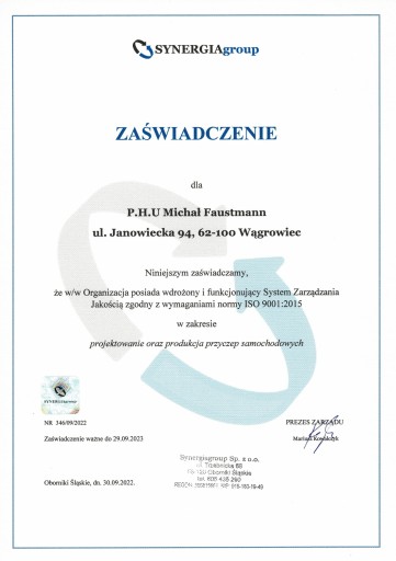 Firma Faustmann posiada certyfikat ISO 9001:2015, który potwierdza nasze zaangażowanie w utrzymanie najwyższych standardów jakości. Dzięki temu masz pewność, że każdy produkt spełnia rygorystyczne wymagania i zapewnia niezawodność w codziennym użytkowaniu.