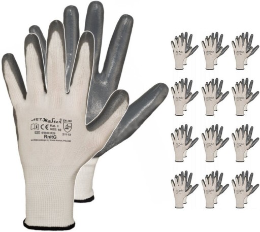 Rękawice ochronne, wykonane z oddychającej dzianiny poliestrowej w kolorze białym, powlekane nitrylem w kolorze szarym. Rękawice zostały wykonane w technologii bezszwowej, dodatkowo zakończone ściągaczem. Powłoka nitrylowa zwiększa odporność na smary i oleje oraz zmniejsza wnikanie brudu. Wytrzymałe, elastyczne, odporne na ścieranie i rozerwanie. Doskonale dopasowują się do dłoni, zapewniają dużą zręczność i pewny chwyt trzymanych narzędzi.