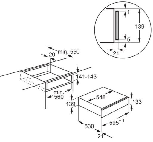 Szuflada do podgrzewania naczyń o wymiarach 139 x 596 x 535 mm oraz o mocy 400 W. Pojemność: 6 kompletów. Regulacja temperatury: 30 - 80 st. C, 4 funkcje (Podgrzewanie jedzenia, Rozmrażanie, Podgrzewanie naczyń, Wyrastanie ciasta).