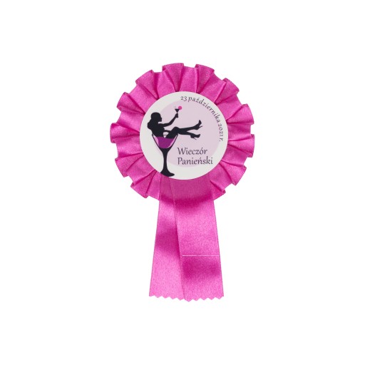 Różowy kotylion z personalizowaną wklejką.
