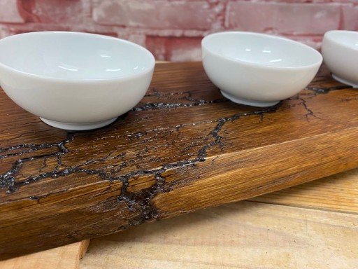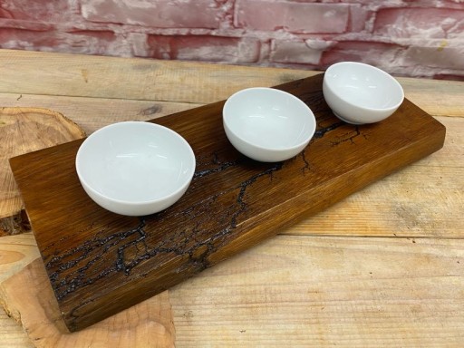 Zestaw trzech porcelanowych miseczek na sosy i dipy oraz drobne przekąski (o pojemności 100 ml każda) z drewnianą, ręcznie robioną podstawką. Deska jest wypalana prądem, który tworzy niepowtarzalne wzory następnie barwiona bejcą wodną i lakierowana.