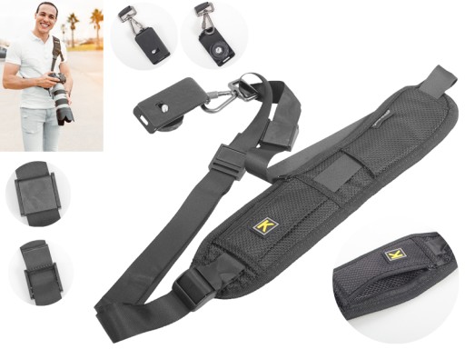 Pasek posiada dodatkowe wejście statywowe, które podpinamy do standardowego wyjścia 1/4''. Dołączonym klipsem przypinamy pasek do aparatu. W dowolnej chwili możemy szybko go odczepić i robić zdjęcia.