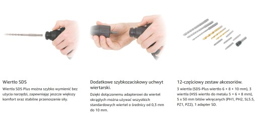Akumulatorowa młotowiertarka DP-CRH 2011 firmy Deltafox przekonuje mocnym silnikiem, dzięki czemu umożliwia bezproblemowe wiercenie i młotkowanie. Dzięki uchwytowi wiertarskiemu SDS wiertła można szybko wymienić bez użycia narzędzi i oferują jeszcze większy komfort i stabilne przenoszenie mocy. Dobrze umieszczone światło LED bardzo dobrze oświetla trudno dostępne, ciemne obszary, umożliwiając precyzyjną pracę.