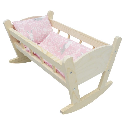 Przepiękna drewniana kołyska dla lalek, z drewna świerkowego z kompletem pościeli.