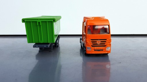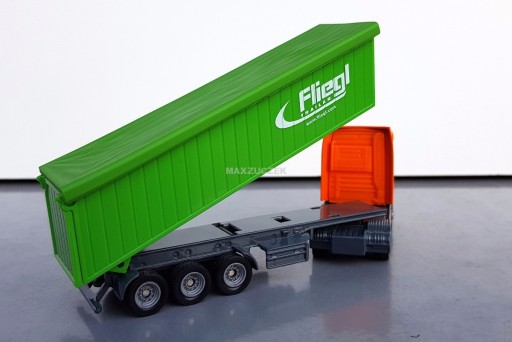 Zgodnie z najnowszymi przepisami bezpieczeństwa materiał sypki może być przewożony już tylko ciężarówkami z plandeką. SIKU wprowadza te aktualne przepisy w życie również w pokoju dziecięcym. Ciągnik samochodowy Mercedes-Benz Actros ciągnie za sobą trzyosiową przyczepę wywrotkę z ruchomym nadwoziem samowyładowczym i przyczepianą plandeką dachową z elastycznego tworzywa sztucznego. Tylna klapa nadwozia samowyładowczego jest ruchoma. Można ją otworzyć bez względu na to, czy plandeka dachowa jest założona, czy też nie.