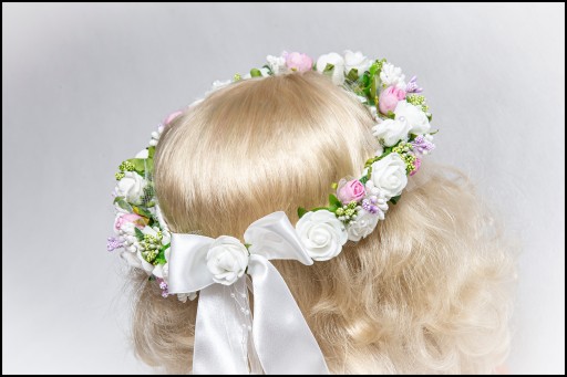 Realistyczny wygląd kwiatów, dodatków oraz wykończenie atłasową kokardą nadają delikatnego i eleganckiego wyglądu dziewczynce w tym ważnym dniu.