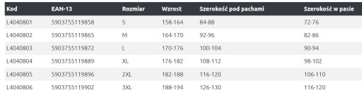 Poniżej tabela z rozmiarami dla lepszego doboru odzieży robocze