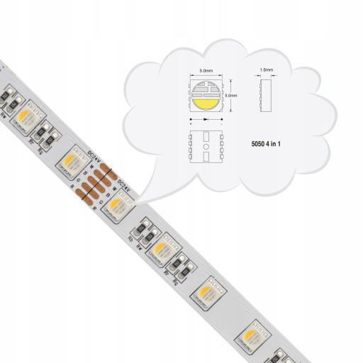 Na 1m taśmy umieszczonych jest 60 diod RGBW SMD 5050. Taśma produkowana jest w rolkach 10-cio metrowych. Na każdym odcinku, czyli na 10m taśmy, znajduje się 600 diod SMD 5050. Istnieje możliwość jej cięcia na mniejsze odcinki w specjalnie wyznaczonych do tego miejscach. Segmenty umożliwiające cięcie taśmy ułożone są co 10 cm. Taki moduł składa się wtedy z sześciu diod RGBW, które są umieszczone szeregowo na elastycznym i podwójnym, białym podkładzie PCB.
