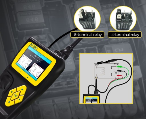 2. [Tryb oscyloskopu i test przekaźnika]: AUTOOL BT280 jest w stanie nie tylko wyświetlić wykres krzywej parametrów testowanego komponentu, takich jak: napięcie, częstotliwość, czas itp., ale może również przetestować przekaźnik samochodowy, taki jak przekaźniki 5-pinowe, i 4-pinowe przekaźniki.