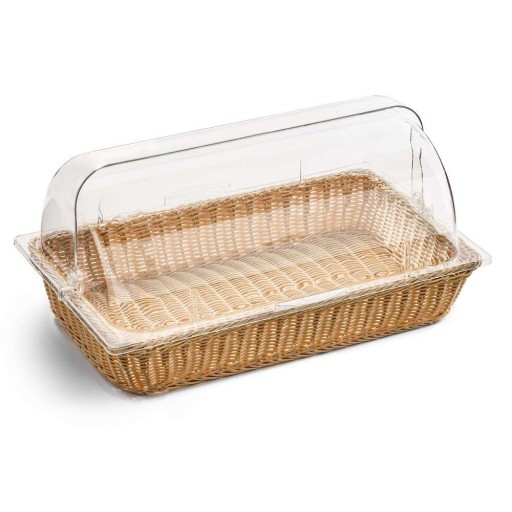 Kosz na pieczywo w rozmiarach GN 1/1. Głębokość kosza 9 cm. W wyposażeniu pokrywa roll-top z poliwęglanu. Prosty, higieniczny i estetyczny sposób na prezentację pieczywa w hotelowym bufecie.