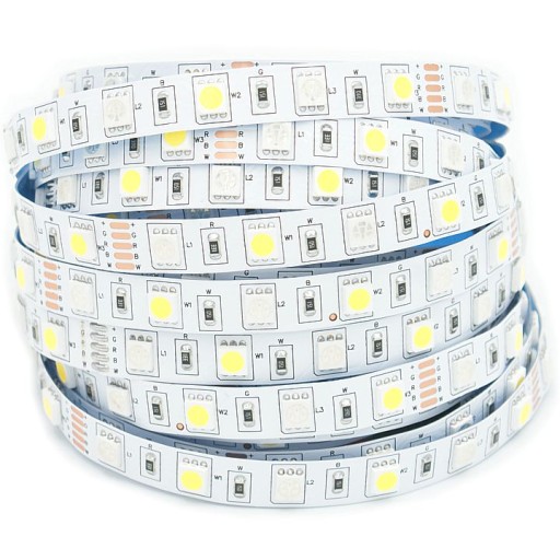 Rolka 5 metrów taśmy LED RGBW, kolorowej RGB z barwą mono ciepłą. Taśma na diodach SMD 5050 o mocy 7.2W na 1m metr, na napięcie DC 12V.