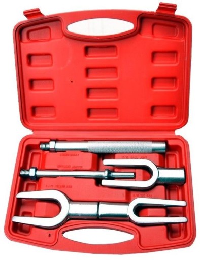 Zestaw ściągaczy widełkowych do drążków kierowniczych i sworzni kulkowych wykonany ze stali chromowo-wanadowej (CrV). Zestaw zawiera trzy ściągacze widełkowe o szerokości wewnętrznej 28, 24, 17 mm oraz dwie rękojeści do dociskania, przystosowane do pracy z młotkiem pneumatycznym lub ręcznym. Ramiona widełek ściągacza posiadają trwałe i równe powierzchnie klinowe pozwalające na łatwe i precyzyjne umocnienie sworzni kulkowych oraz drążków kierowniczych.