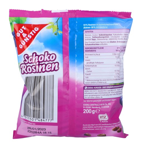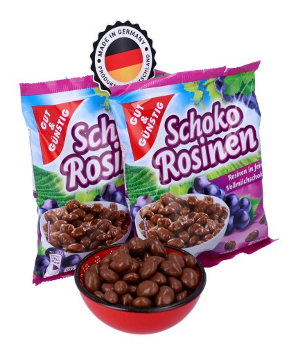 Rodzynki w pysznej mlecznej czekoladzie z niemieckiej marki Gut&Gunstig. Pyszne połączenie, które zadowoli zarówno zwolenników bakalii jak i czekolady mlecznej. Jest to jednocześnie zdrowsza alternatywa dla typowo czekoladowych przekąsek