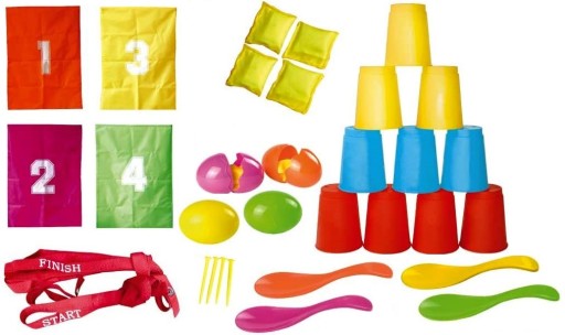 Idealny na urodziny dziecka, ten zestaw z popularnymi grami na jajkach, rzucaniu puszek i skakaniu z worka. W zabawie dzieci trenują zręczność i równowagę.