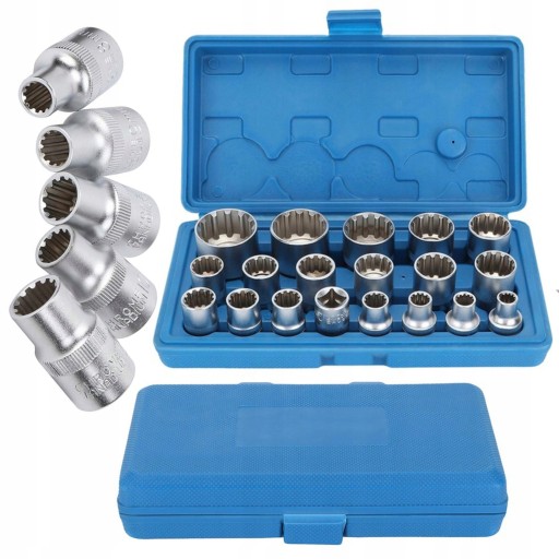 Praktyczny zestaw kluczy SPLINE z nasadką 1/2" w plastikowej walizce do przechowywania. W zestawie 19 sztuk w popularnych rozmiarach. Nasadki opracowane z myślą o profesjonalnym zastosowaniu. Wykonane są z wytrzymałej stali chromowo-wanadowej (CrV 50bv30+6150).