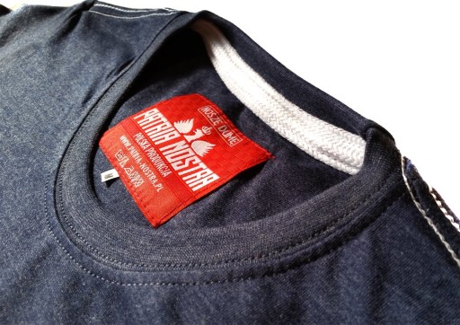 Oprócz naszych stałych dodatków w postaci firmowych żakardów oraz naszywki, koszulkę urozmaicają biała tasiemka wzmacniająca górną część koszulki, obszyta również białą nicią, metodą podwójnego ściegu łańcuszkowego. Koszulkę uzupełnia potnik w kolorze jeansowym.