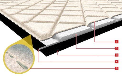 - Pianka poliuretanowa (4mm) o zwiększonej elastyczności, zapobiega ubytkom sztywności podczas użytkowania oraz zapewnia przepuszczalność powietrza dzięki otwarto-porowatej strukturze komórkowej.