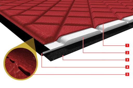 - Pianka poliuretanowa (4mm) o zwiększonej elastyczności, zapobiega ubytkom sztywności podczas użytkowania oraz zapewnia przepuszczalność powietrza dzięki otwarto-porowatej strukturze komórkowej.