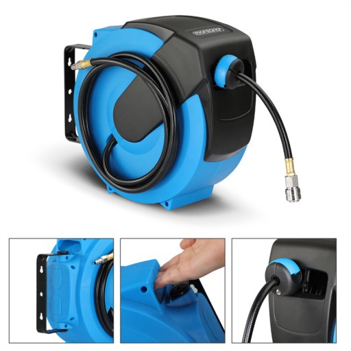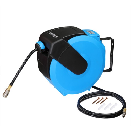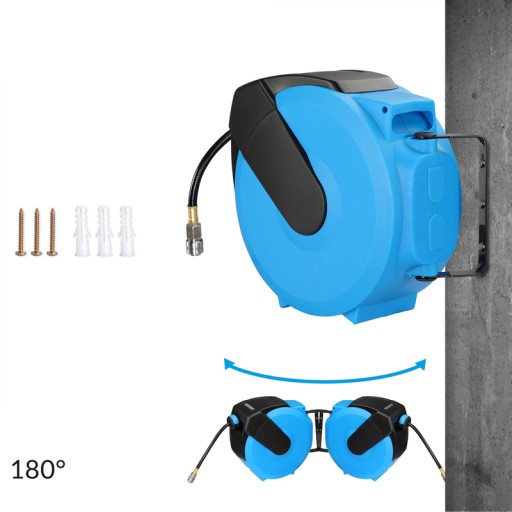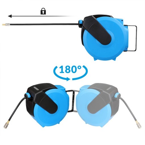 Wąż bębnowy na sprężone powietrze pozwoli zachować porządek. Uchwyt ścienny ułatwia instalację i elastyczny obrót o 180°. Dzięki automatycznemu zwijaniu, wąż zostanie szybko i starannie złożony. Bęben jest wstępnie zmontowany, gotowy do użytku.