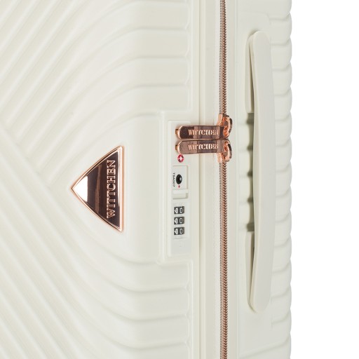 Walizka o średniej wielkości stworzona z polikarbonu z matowym wykończeniem. To designerski projekt z lśniącymi okuciami w kolorze różowego złota. Kółka wykonane z tworzywa sztucznego ABS z elastyczną powłoką. Wnętrze walizki pokrywa beżowa podszewka z logo WITTCHEN.