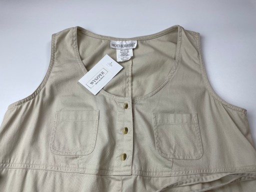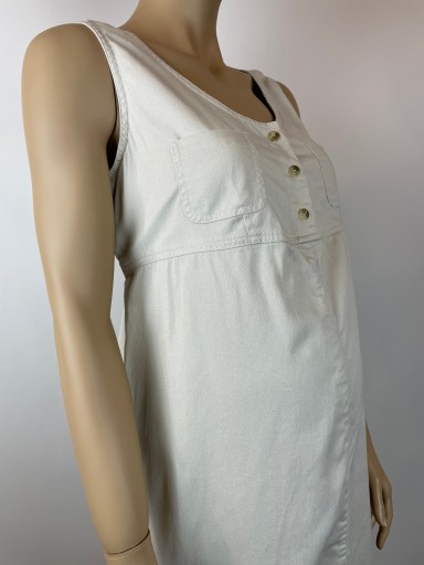 Cudowna ciążowa sukienka, którą możesz założyć śmiało na wiele okazji! Sukienka jest w kolorze ecru. Sukienka jest bez rękawów. Klasycznie wycięty okrągły dekolt w elegancki sposób odsłania szyję. To idealna propozycja dla kobiet, które cenią sobie wyjątkowy wygląd i elegancję. Załóż sukienkę i ciesz się zjawiskowym wyglądem cały czas! Sukienka jest odcinana pod biustem i wiązana z tyłu. Sukienka idealnie dopasuje się do sylwetki i do rosnącego brzuszka.Taki model sukienki, z pewnością będzie się bardzo wygodnie nosił. Sukienka posiada niewielkie ślady użytkowania w postaci plamek, co naszym zdaniem nie wpływa na jej ogólną prezentację. Skład materiałowy z metki to 100% bawełna.