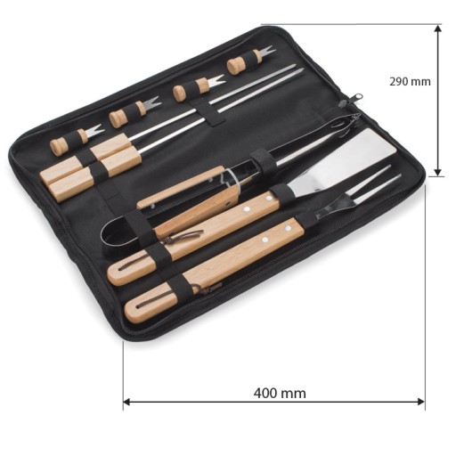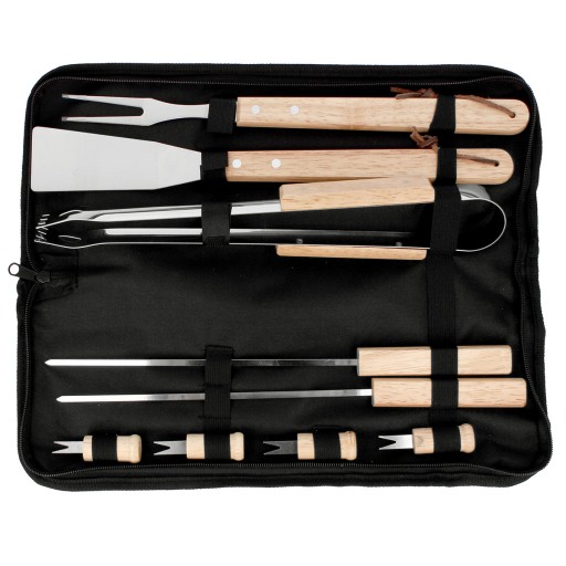Akcesoria do grilla zapakowane są w czarne etui zamykane na zamek i wyposażone w pasek do przenoszenia.
