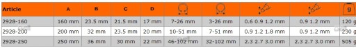 - Szczególnie wyróżniający typ 2928-160, który jest odpowiedni dla zakresu średnic normalnie obsługiwanych przez 10 różnych klasycznych szczypiec