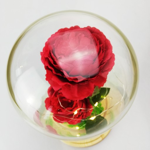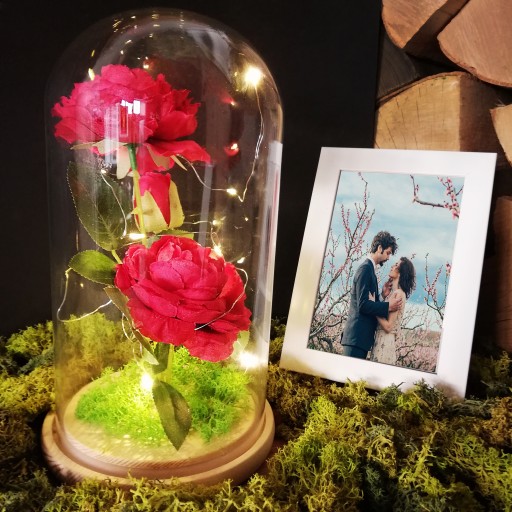 Wspaniała róża, zamknięta w szklanej kopule. Oświetlona wewnątrz łańcuszkiem z lampkami LED. Róża umieszczone są na drewnianej podstawce.