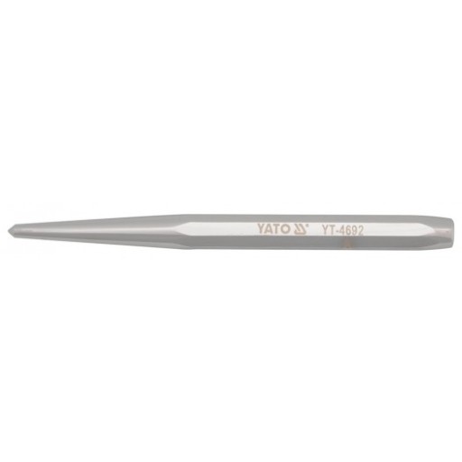 Część robocza staczana, stożkowa z końcówką ostrą, pozostawiającą ślad na materiale po uderzeniu młotkiem, długość całkowita 120 mm, uchwyt o profilu sześciokątnym 9,4 mm. Wykonany ze stali CrV60 w całości chromowany, powierzchnia polerowana, lustrzana .