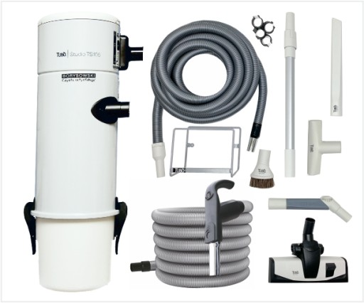 Jednostka ssąca systemu centralnego odkurzania z filtracją cykloniczną z dodatkowym wkładem filtracyjnym wykonanym z poliestru. Zestaw zawiera DWA węże ssące o długości 9m w tym jeden ON/OFF z wyłącznikiem w uchwycie oraz akcesoria do sprzątania. Zestaw akcesoriów do sprzątania: Wieszak metalowy na wąż ssący. Uchwyt na akcesoria do sprzątania. Szczotki: do odkurzania mebli, do szczelin, do wykładziny i dywanów, dwufunkcyjna klawiszowa do podłóg twardych i wykładzin. Rura teleskopowa aluminiowa przedłużająca.