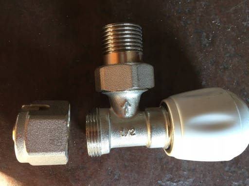 Zawór grzejnikowy Poker, kątowy, ze śrubunkiem 13 mm (1/2"), do rur stalowych, marki EMETTI