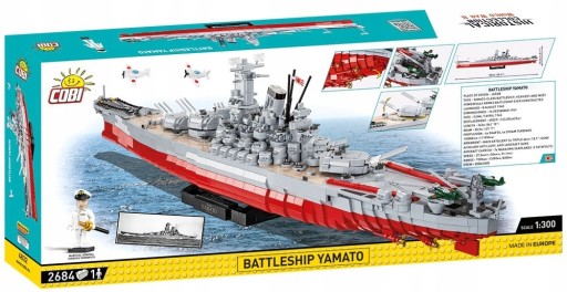 Yamato to ogromny model z klocków konstrukcyjnych COBI. Podobnie jak pozostałe okręty wojenne został zaprojektowany w modelarskiej skali 1:300. Najnowsza edycja to nie jest wznowienie! Okręt został przebudowany i zawiera najnowsze klocki oraz rozwiązania konstrukcyjne. Jeszcze wierniej oddaje nawet najdrobniejsze detale i szczegóły swego historycznego pierwowzoru. Po złożeniu 2684 elementów bryła pancernika ma aż 90 cm (30.4) długości i 19,5 cm (7.7) cm wysokości. Posiada wiele ruchomych elementów takich jak: działa pokładowe i baterie przeciwlotnicze, obrotowe wieże artyleryjskie, ster czy śruby napędowe. Do zestawu dołączona jest specjalna podstawka ekspozycyjna z tabliczką, na której wydrukowana jest nazwa okrętu. Pięknym dodatkiem jest wyjątkowy klocek imitujący Złotą Orchideę, czyli cesarski symbol, który ozdabiał dziób okrętu. Model jest idealny dla wszystkich miłośników historii, militariów, marynistyki i techniki wojskowej. Prezentuje się znakomicie, budząc podziw i zainteresowanie! Dzięki intuicyjnej instrukcji opartej na czytelnych ikonach budowa jest prosta i nie sprawia trudności. Szacowany czas budowy modelu to około 8 godzin, podczas, których budujemy historię! Model został zaprojektowany i wyprodukowany w Polsce (EU).