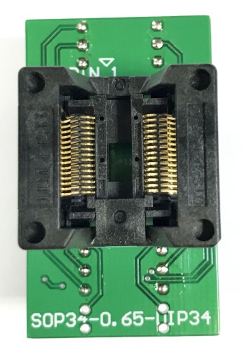 Zastosowana profesionalna podstawka ZIF firmy Enplas / HMILU (OTS-30(34)-0.65-01) z systemem dual clamp chwyta wyprowadzenia układu zarówno z góry jak i z dołu (a nie tylko z dołu jak tańsze podstawki) - co zapewnia lepszy kontakt z układem.