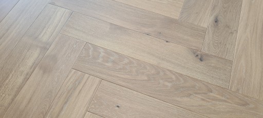 Klasyczny i stylowy parkiet lamelowy w jodełkę z dębowego szczotkowanego białego matowego lakieru. 1-lamelowość powierzchni podłogi podkreślona fazowaniem. Rysunek słoi i głębia barwy drewna uwydatnione dzięki szczotkowaniu i pokryciu matowym lakierem.