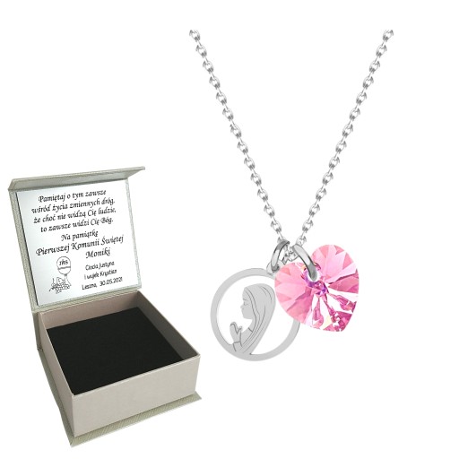 Przedstawiamy Państwu cudowny naszyjnik medalik Matka Boska Fatimska dla dziewczynki z pięknym kryształowym serduszkiem w pudełku z grawerem.