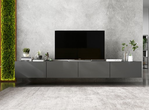Dwie nowoczesne szafki w kolorze grafit mat, posiadają łącznie cztery przestronne zamykane komory. Szafki te są umieszczone obok siebie tworząc jeden długi, bardzo ładnie prezentujący się mebel. Posiadają one drzwiczki uchylne z blokadą ich opadania (do regulacji). Zapewnia to swobodny dostęp do ich wnętrza. Połączenie tych dwóch szafek daje ogromną pojemność tego zestawu. Wygodne bezuchwytowe otwieranie frontów nadaje jej elegancki wygląd.