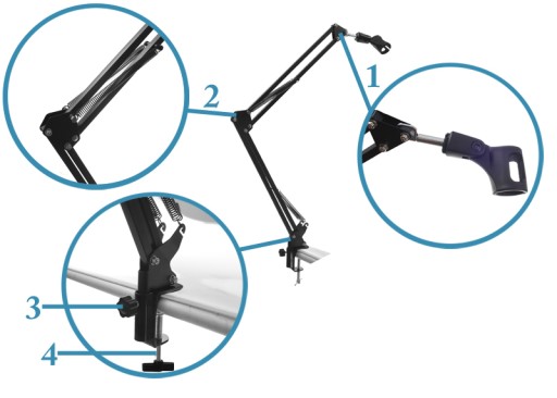 Uchwyt posiada zacisk typu imadło, dzięki czemu możemy zamontować mikrofon na stole, biurku, czy blacie.