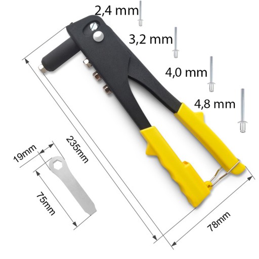 W zestawie znajdują sie aż 4 końcówki do różnej grubości nitów (2,4/3,3/4,0/4.8 mm). Dzięki swojemu rozbudowanemu zestawowi doskonale sprawdzi się podczas budowy, czy łączenia zderzaka twojego auta. Końcówki sprawią, że będzie ona uniwersalnym narzędziem do każdego połączenia. Sprawdzi się w drobnych pracach domowych ale również tych bardziej wymagających np. w warsztacie samochodowym.