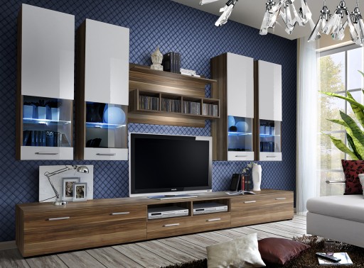 Witryny wiszące: front wysoki połysk z wpuszczona szybą, wewnątrz jest jedna szklana oraz dwie zwykłe półki, cztery sztuki w komplecie.
