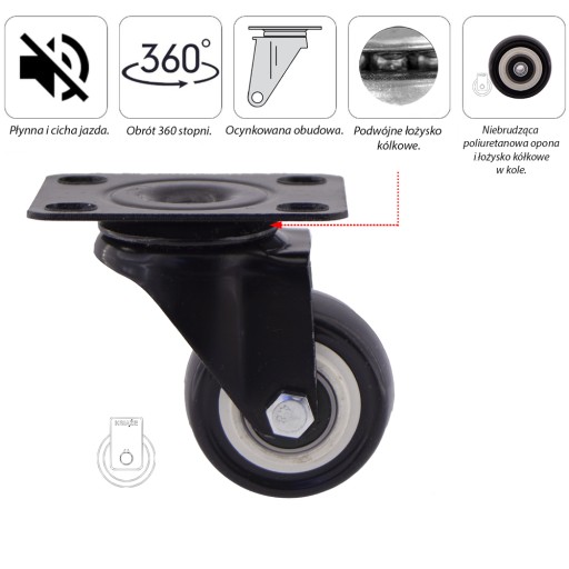 - KOŁO składa się z polipropylenowej piasty oraz z niebrudzącej poliuretanowej opony, posiada podwójne łożysko kulkowe. Kółka mają wytrzymałość po 70 kg na kółko. Wolno się zużywają, są odporne na uszkodzenie, amortyzują uderzenia i wibracje. Obracają się o 360 stopni ułatwiając manewrowanie meblami czy wózkiem. Gładko obracają się po twardych i gładkich powierzchniach jak beton przy bardzo małym tarciu.