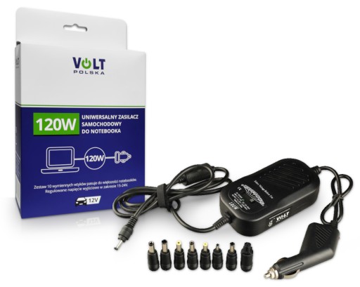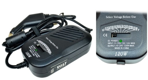 Uniwersalny zasilacz samochodowy do laptopa DC 120W jest zasilany napięciem z zakresu 11-14,5V. Napięcie wyjściowe wybierane jest za pomocą przełącznika na obudowie. Do zestawu dołączona jest zaślepka, która pozwala zablokować przełącznik na wybranej wartości napięcia wyjściowego.