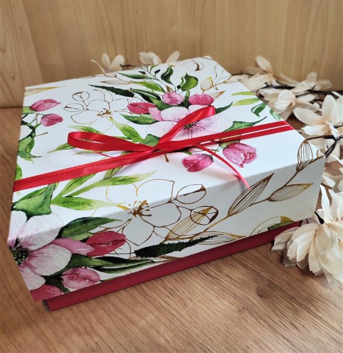 Cena zawiera usługę pakowania na prezent wraz z pudełkiem prezentowym z karbowanej tektury wypełnionej wełną drzewną z okienkiem oraz przewiązanego wstążką z rafii