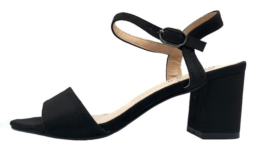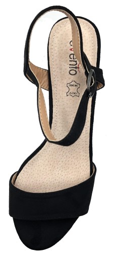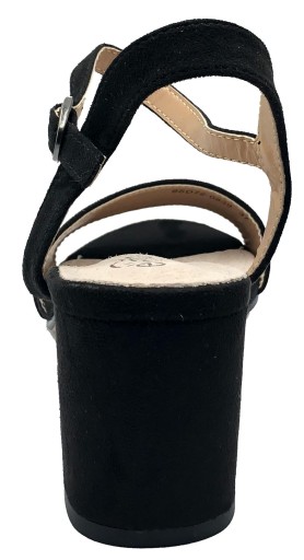 Sandał damski na obcasie wykonany z ekologicznej skóry w kolorze czarnym firmy EVENTO. Zapięcie z klamerką. Stabilny 7 cm obcas oraz skórzana wkładka zapewnią komfort podczas użytkowania.